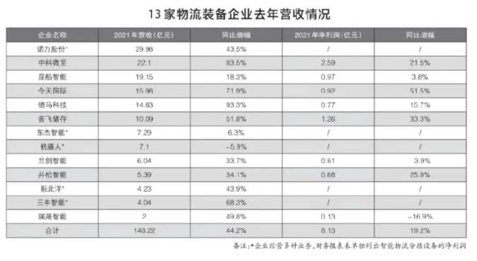截至4月30日,A股主要上市企業(yè)均發(fā)布年報(bào),其中包括以智能物流分揀系統(tǒng)為主要業(yè)務(wù)的11家企業(yè),加之即將IPO的2家企業(yè)披露全年業(yè)績(jī),13家企業(yè)2021年?duì)I收合計(jì)為148.1億元,2020年為102.8億元,增長(zhǎng)44.2%(見圖表)。