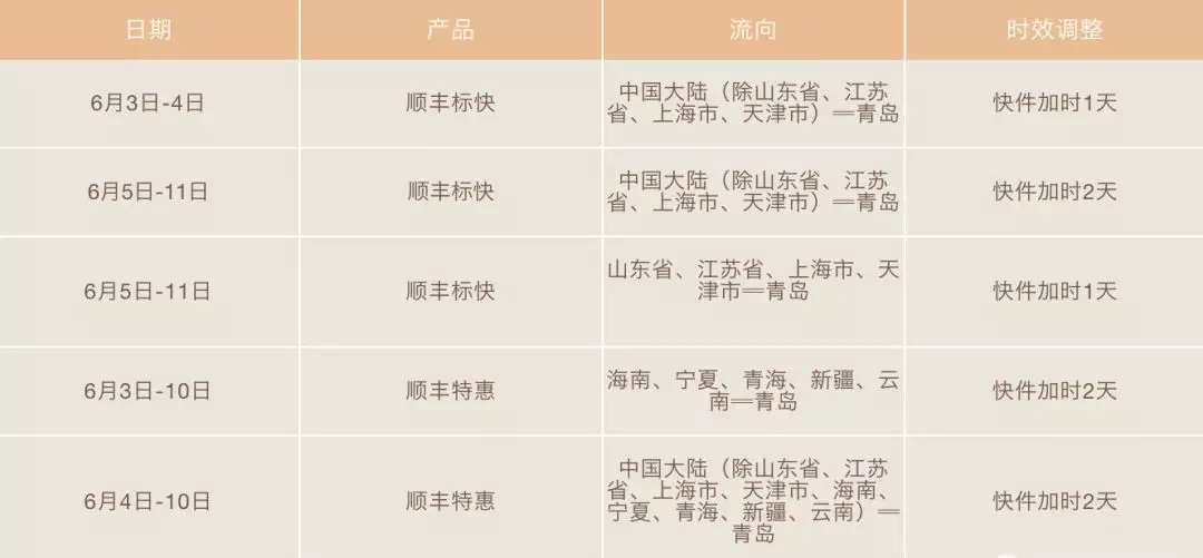6月3日-11日,全網(wǎng)進出青島流向的順豐次晨、即日、生鮮速配、部分醫(yī)藥冷運等對溫度及時效要求較高的產(chǎn)品和冷藏冷凍件停收,物流普運等重貨類產(chǎn)品停收(重貨快運加時不停收)。
